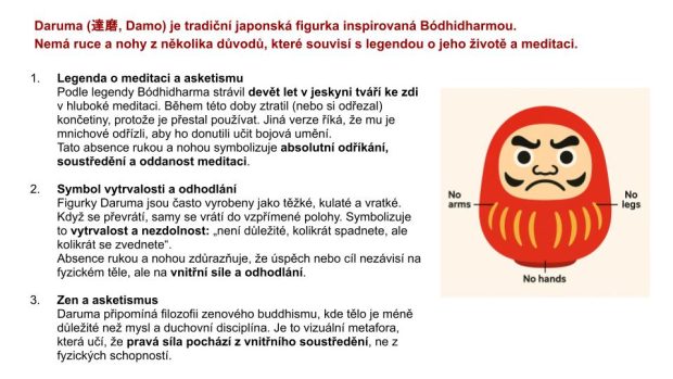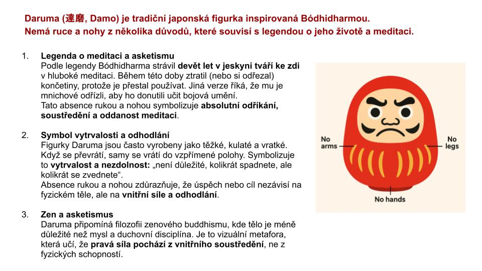 Tradiční japonská soška Daruma znázorňuje mnicha Bódhidharmu. Stala se talismanem štěstí, vytrvalosti a odolnosti. Používá se k podpoře dosažení osobních cílů.